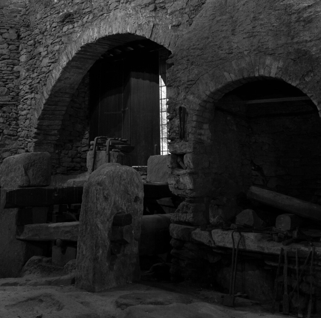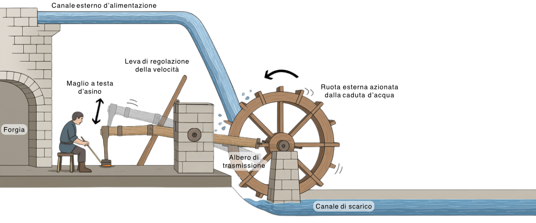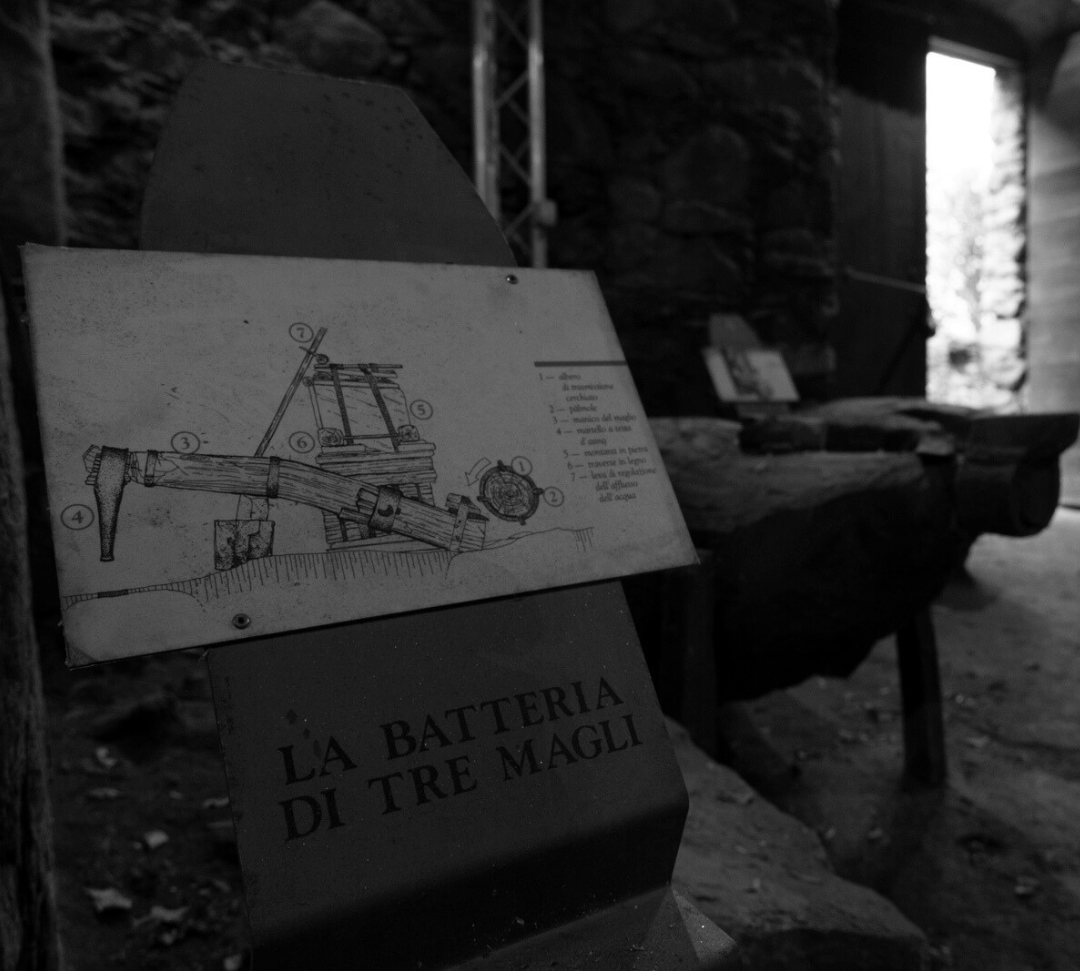 Sui lati della fucina c'erano due camini, le forge, che servivano a riscaldare le balle nelle varie fasi di lavorazione, tenendole a 500- 600° per renderle duttili e malleabili.